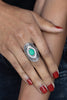 An oversized turquoise stone is set inside a circular silver frame, creating a bold statement piece. The frame ripples out from the stony center, adding dimension and handcrafted detail to the design. Features a stretchy band for a flexible fit. As the stone elements in this piece are natural, some color variation is normal.