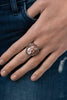 Glistening brass filigree blooms from a shimmery floral center, creating a whimsical band across the finger. Features a stretchy band for a flexible fit.