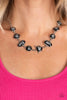 Featuring rustic finishes, hammered brass hoops and holey brass discs link with sections of oversized brass links across the chest for an artisan inspired look. Features an adjustable clasp closure.