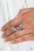 Glittery red and white rhinestones are scattered along arcing silver bands, coalescing into a refined frame. Features a stretchy band for a flexible fit.