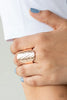 A white rhinestone encrusted, decorative silver, and shiny silver band stack across the finger. A glittery blue rhinestone crowns the uppermost band for a regal finish. Features a stretchy band for a flexible fit.
