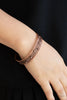 Stamped in an arrow pattern, an antiqued copper cuff curls around the wrist for a textured finish.