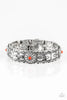 A shiny silver floral charm glides along stretchy strands of mismatched red seed beads, creating vibrant layers around the wrist.