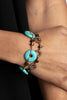 Blue wooden discs and chunky brown wooden beads are threaded along a stretchy band around the wrist, creating a summery look.