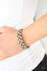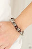 White wooden beads and distressed brown wooden discs alternate along a stretchy band around the wrist, creating a colorful pop of summer flavor.