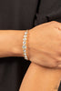 Glittery oil spill gems are pressed into sleek gunmetal frames. Infused with dainty gunmetal beads, the sparkly frames are threaded along stretchy bands for a glamorous look around the wrist.