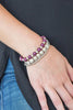 Rows of flat silver discs, glassy white rhinestones, and shimmery gunmetal chains are encrusted along purple suede bands for a sassy look. Features an adjustable snap closure. Sold as one individual bracelet.
