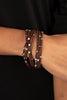 A tropical collection of distressed yellow wooden discs and brown oval wooden beads are decoratively threaded along stretchy bands around the wrist, creating a refreshing pop of summery fun.