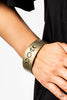 Stamped in snake chain detail, antiqued brass ovals and matching brass links interlock across the wrist for a wild industrial look. Features an adjustable clasp closure.