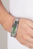 A collection of polished green, shiny silver, and faceted crystal-like beads are threaded along stretchy bands, creating colorful layers around the wrist.