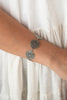 Featuring purple acrylic beads, a mismatched collection of asymmetrical silver circle, square, and teardrop frames link around the wrist on an elastic stretchy band. Silver beads in various sizes separate each shape, while accents of white glitz and iridescent beads unite into a glitzy mashup around the wrist. Due to its prismatic palette, color may vary.