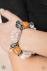 Six strands of rich wooden beads are threaded long stretchy elastic bands, creating a casual and comfortable design. Wooden bars are added to each side of the stack, separating the layers and bringing a handcrafted vibe to the piece.