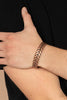 A shiny copper frame wraps around an earthy wooden disc, creating an abstract centerpiece atop a bold shiny copper cuff for a trendy finish.