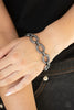 Glistening gunmetal bars braid across the wrist, creating a boldly plaited cuff.