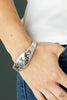 A collection of pearly silver beads and ornate silver beads are threaded along an elastic band around the wrist for a refined fashion. Sold as one individual bracelet.