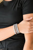 An enchanting assortment of silver floral beads and studded silver rings join an opaque, glassy, and iridescent assortment of purple and white beads along a stretchy band around the wrist for a whimsical pop of color.