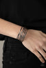 Featuring oversized black rhinestone centers, glittery white rhinestone floral frames join pairs of classic silver beads along stretchy bands around the wrist for a glamorous display.