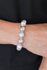 A playful collection of shiny silver beads and sparkly red crystal-like beads are threaded along stretchy bands around the wrist, resulting in colorful layers.