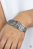 Delicate Amethyst Orchid rhinestones dot the centers of engraved antiqued silver discs. The dotted textures and heart shaped vines create a charming impression as they gracefully link around the wrist. Features an adjustable clasp closure.