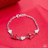A collection of white rhinestone encrusted rings, pink pearls, and classic silver beads are threaded along a stretchy band around the wrist for a glamorous look.