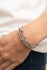 A collection of white rhinestone encrusted rings, silver pearls, and classic silver beads are threaded along a stretchy band around the wrist for a glamorous look.