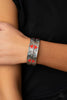 Stacks of rubbery red discs and bold silver rings are threaded along a stretchy band around the wrist, creating a versatile pop of color.