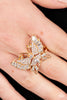 Swirls of silver filigree curl into the shape of a butterfly, creating a whimsical pendant that swings from the bottom of a long silver chain. Glassy green cat's eye stones layer atop the silver filigree, adding three-dimensional detail and a fresh pop of color, while classic white rhinestones line the center of the design and dot the wings. Features an adjustable clasp closure.
