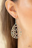 A thick gunmetal teardrop frame drips from the ear, creating an alluring lure. Earring attaches to a standard fishhook fitting.