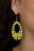 Scratched in shimmery textures, a mismatched collection of round and oval silver frames link and connect into a pair of abstract lures. Flat yellow cat's eye-like accents haphazardly adorn the display, adding asymmetrical allure to the whimsical pair. Earring attaches to a standard post fitting.