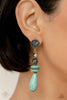 Infused with earthy wooden accents, studded silver rings and pieces of blue shell-like pebbles alternate along a dainty wire hoop for a tropical inspiration. Earring attaches to a standard fishhook fitting.