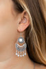 Brushed in a white finish, a studded silver filigree filled frame swings from the ear for a whimsical look. Earring attaches to a standard fishhook fitting. Sold as one pair of earrings.