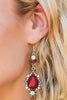 Glassy red teardrops and faceted silver beads swing from the bottom of a shimmery silver hoop radiating with sunburst patterns for a whimsical look. Earring attaches to a standard fishhook fitting. Sold as one pair of earrings.