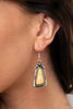 Four dainty yellow rhinestones haphazardly adorn the front a leafy silver frame filled with airy geometric detail, creating a sparkly seasonal display. Earring attaches to a standard fishhook fitting.
