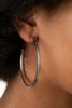 Shimmery gunmetal discs dance along the bottom of two gunmetal frames that delicately link into an airy hoop, creating a playful metallic fringe. Earring attaches to a standard fishhook fitting.