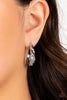 A spiral-textured silver frame featuring dainty white rhinestone accents and a glassy opalescent green bead center anchors a dazzling floral frame. The white marquise-cut gem petals and glassy opalescent center are accented by stacked white rhinestones, highlighting the handcrafted features and sheen of the design. Earring attaches to a standard fishhook fitting.