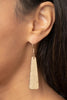 Two white beads with gold foil are encased in an ornate airy gold frame swirling with filigree detail. Dainty gold studs frame around the beads, creating a whimsical finish. Earring attaches to standard fishhook fitting.