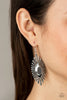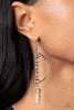 A slim oversized silver ring, highlighted by two concentric circles of dotted texture, dangles from an oval hematite gem for an edgy refined look. Earring attaches to a standard fishhook fitting.