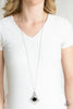 A shimmery silver bar is pressed between two black crescent shaped stones bordered in shattered silver texture. The handcrafted frame swings from the bottom of a lengthened silver chain, creating a colorful pendant. Features an adjustable clasp closure.