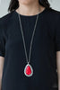 A compilation of fiery red stone beads, silver rings, and hammered silver accents connect across the chest for an artisan flair. Features an adjustable clasp closure.