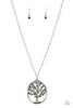 A triangular Military Olive bead is pressed into the top of a studded silver frame at the bottom of a classic silver chain. Flared silver bars swing from the bottom of the colorful pendant, creating a bold fringe. Features an adjustable clasp closure.