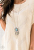 A floral embossed silver disc and dainty wooden and turquoise stone beads swing from the bottom of a lengthened silver chain for a whimsical look. Features an adjustable clasp closure.