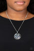 Glistening silver hoops and a blue rhinestone encrusted ring swing from the bottom of a lengthened silver chain, creating a glamorous pendant. Features an adjustable clasp closure.