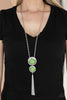 Glistening silver chains drape across the chest, creating four shimmery layers. A dainty silver disc swings from the uppermost layer above a neutral gray stone, ornate triangular frame, and hammered silver arrowhead pendant for an artisan inspired look. Features an adjustable clasp closure. Sold as one individual necklace. Includes one pair of matching earrings.