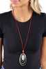 A trio of elongated mismatched warped silver rings swings from the bottom of an elongated blue string, creating an asymmetrically stacked pendant. A hammered silver oval disc swings in the center of the warped rings, adding a dash of tactile texture. Features an adjustable clasp closure.