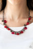 Brushed in a shell-like iridescence, a collection of flat red beads and mismatched silver hoops give way to layers of silver chains down the chest for a whimsical look. Features an adjustable clasp closure. Sold as one individual necklace. Includes one pair of matching earrings.