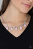 A silver floral frame swings from the uppermost chain, above a strand of faceted pink beads swinging from a shimmery silver chain. A silver crescent frame swings from the lowermost chain, creating whimsical layers down the chest. Features an adjustable clasp closure.