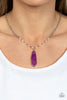 A silver floral frame swings from the uppermost chain, above a strand of faceted purple beads swinging from a shimmery silver chain. A silver crescent frame swings from the lowermost chain, creating whimsical layers down the chest. Features an adjustable clasp closure. Sold as one individual necklace. Includes one pair of matching earrings.