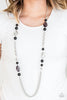 Sections of shiny silver, polished black, and glassy beads trickle along a shimmery silver chain along the chest for a flirtatious look. Features an adjustable clasp closure. Sold as one individual necklace. Includes one pair of matching earrings.