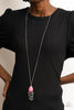 Ringed in a studded silver frame, glittery pink and hematite rhinestones collect into a glamorous pendant at the bottom of a lengthened silver chain for a refined flair. Features an adjustable clasp closure. Sold as one individual necklace. Includes one pair of matching earrings.