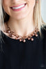 A white shell-like disc swings from the top of a flat copper hoop at the bottom of a lengthened copper chain. A flat copper crescent frame swings from the bottom of the display, creating a sleekly stacked pendant. Features an adjustable clasp closure.